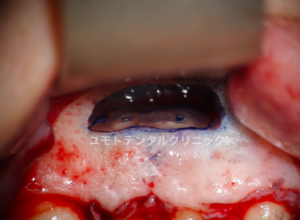本ケースにおいては唇側から口蓋側に交通する骨欠損を生じていたため、骨の完全な再生ではなく瘢痕治癒という形態を最終的なゴールと定めさせていただきました。