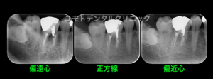 (当時 正方線、偏近心撮影を行い、ポスト部周囲に疑問を感じ偏遠心撮影を加えて行っています。)